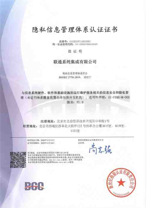 2020年11月13日,聯(lián)通系統(tǒng)集成有限公司(以下簡(jiǎn)稱(chēng):聯(lián)通系統(tǒng)集成)順利獲得由新世紀(jì)檢驗(yàn)認(rèn)證有限責(zé)任公司(以下簡(jiǎn)稱(chēng):BCC)頒發(fā)的ISO/IEC 27701 隱私信息管理體系認(rèn)證證書(shū)。