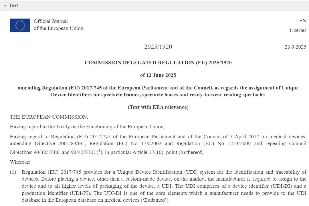 近日,歐盟官方期刊(OJ EU)發(fā)布了《歐盟委員會授權(quán)法規(guī)(EU)2025/1920》,對《醫(yī)療器械法規(guī) (EU) 2017/745》(MDR)中關(guān)于眼鏡框架、眼鏡鏡片和即戴式老花鏡的唯一器械標(biāo)識(UDI)要求進行了重要修訂。