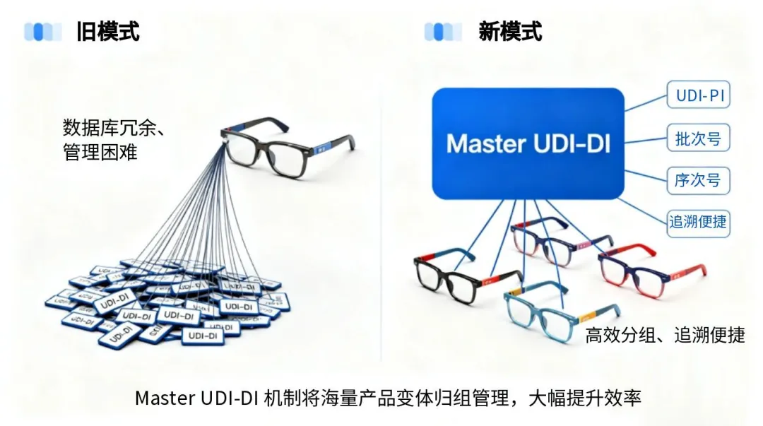 然而,眼鏡框架、眼鏡鏡片和即戴式老花鏡等產(chǎn)品由于存在大量的設(shè)計參數(shù)和結(jié)構(gòu)變體,同一型號下可能衍生出海量UDI-DI。按照原有規(guī)則,每個產(chǎn)品變體都需單獨分配 UDI-DI,導(dǎo)致同類眼鏡產(chǎn)品的 UDI-DI 數(shù)量激增。