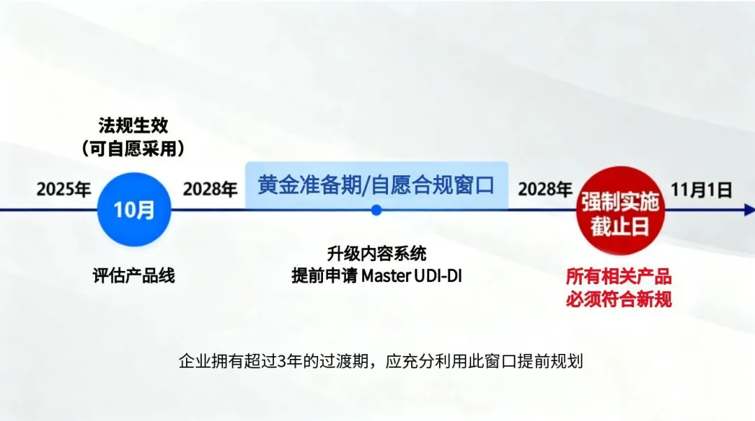 3. 提前合規(guī)窗口:法規(guī)允許制造商在 2028 年 11 月 1 日前,提前按照新規(guī)則分配 Master UDI-DI,為企業(yè)預(yù)留了充足的系統(tǒng)調(diào)整時間。