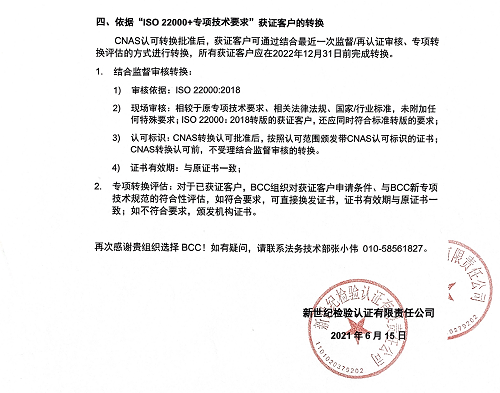 2021年7月1日(含)后通過認證決定的,依據(jù)本告知書第四條款通過專項轉換評估后,經評估符合要求的,頒發(fā)依據(jù)“ISO22000:2018”的認證證書;經評估不符合要求的,頒發(fā)BCC機構證書;
