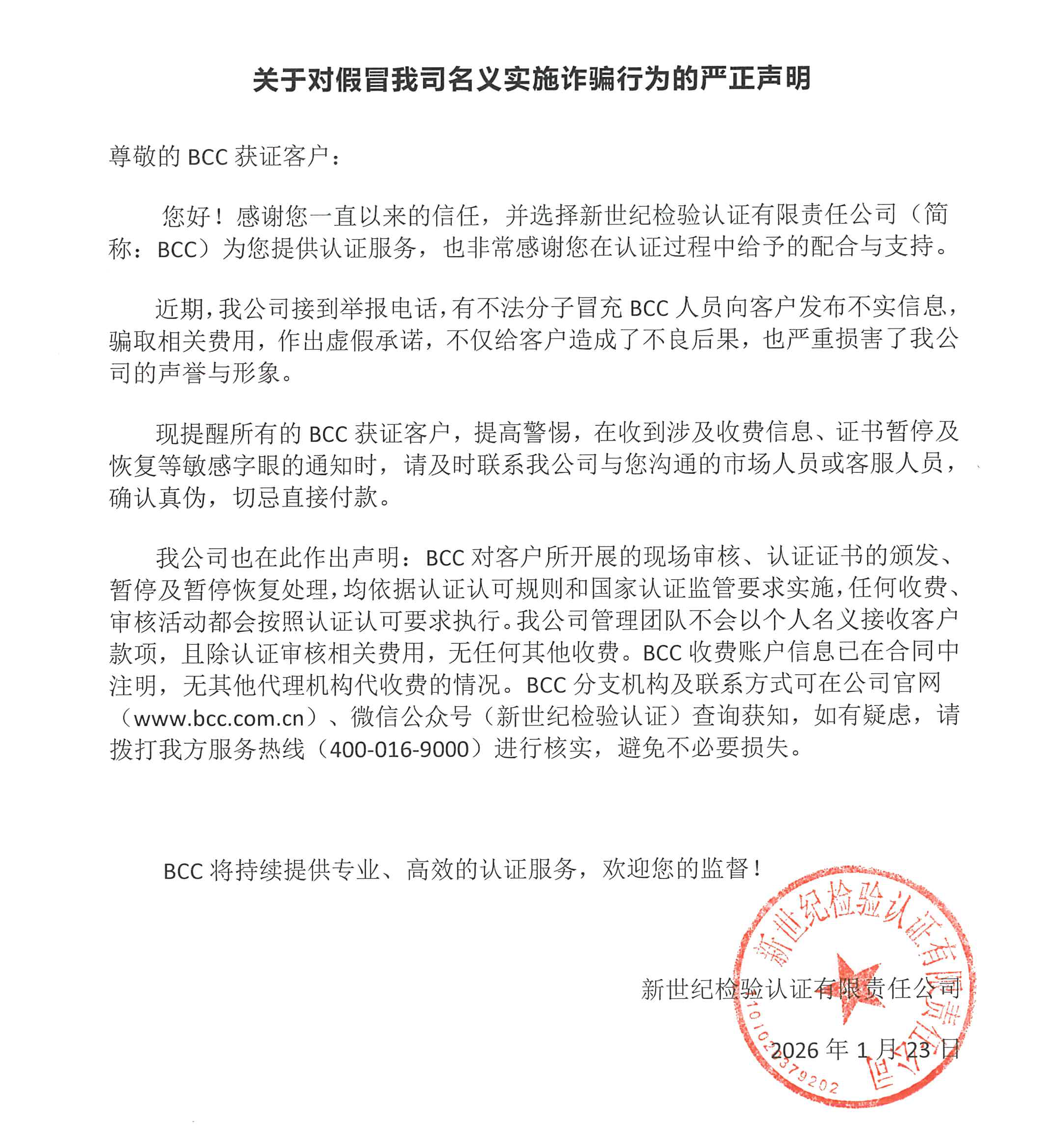 我公司也在此作出聲明:BCC對客戶所開展的現(xiàn)場審核、認(rèn)證證書的頒發(fā)、暫停及暫?;謴?fù)處理,均依據(jù)認(rèn)證認(rèn)可規(guī)則和國家認(rèn)證監(jiān)管要求實施,任何收費、審核活動都會按照認(rèn)證認(rèn)可要求執(zhí)行。我公司管理團(tuán)隊不會以個人名義接收客戶款項,且除認(rèn)證審核相關(guān)費用,無任何其他收費。BCC收費賬戶信息已在合同中注明,無其他代理機構(gòu)代收費的情況。BCC分支機構(gòu)及聯(lián)系方式可在公司官網(wǎng)(m.njqingqiao.com)、微信公眾號(新世紀(jì)檢驗認(rèn)證)查詢獲知,如有疑慮,請撥打我方服務(wù)熱線(400-016-9000)進(jìn)行核實,避免不必要損失。
