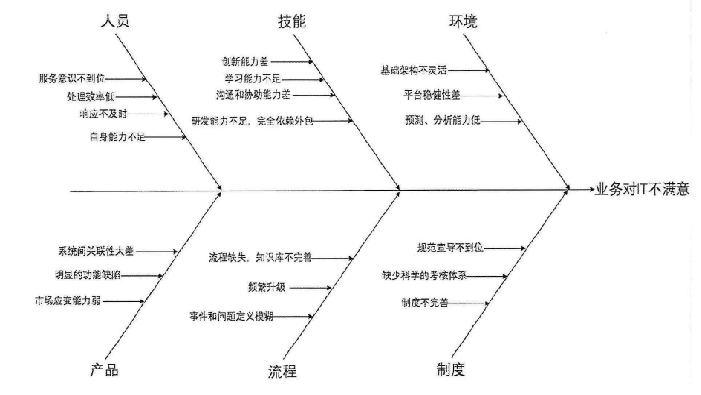 業(yè)務(wù)對(duì)IT服務(wù)不滿意的因素可以歸結(jié)在人、物、軟能力、外部環(huán)境、流程和規(guī)則制度六個(gè)方面。在對(duì)各種影響因素進(jìn)行分析后,進(jìn)一步尋找服務(wù)不滿的真正原因,繪制出魚(yú)骨圖。