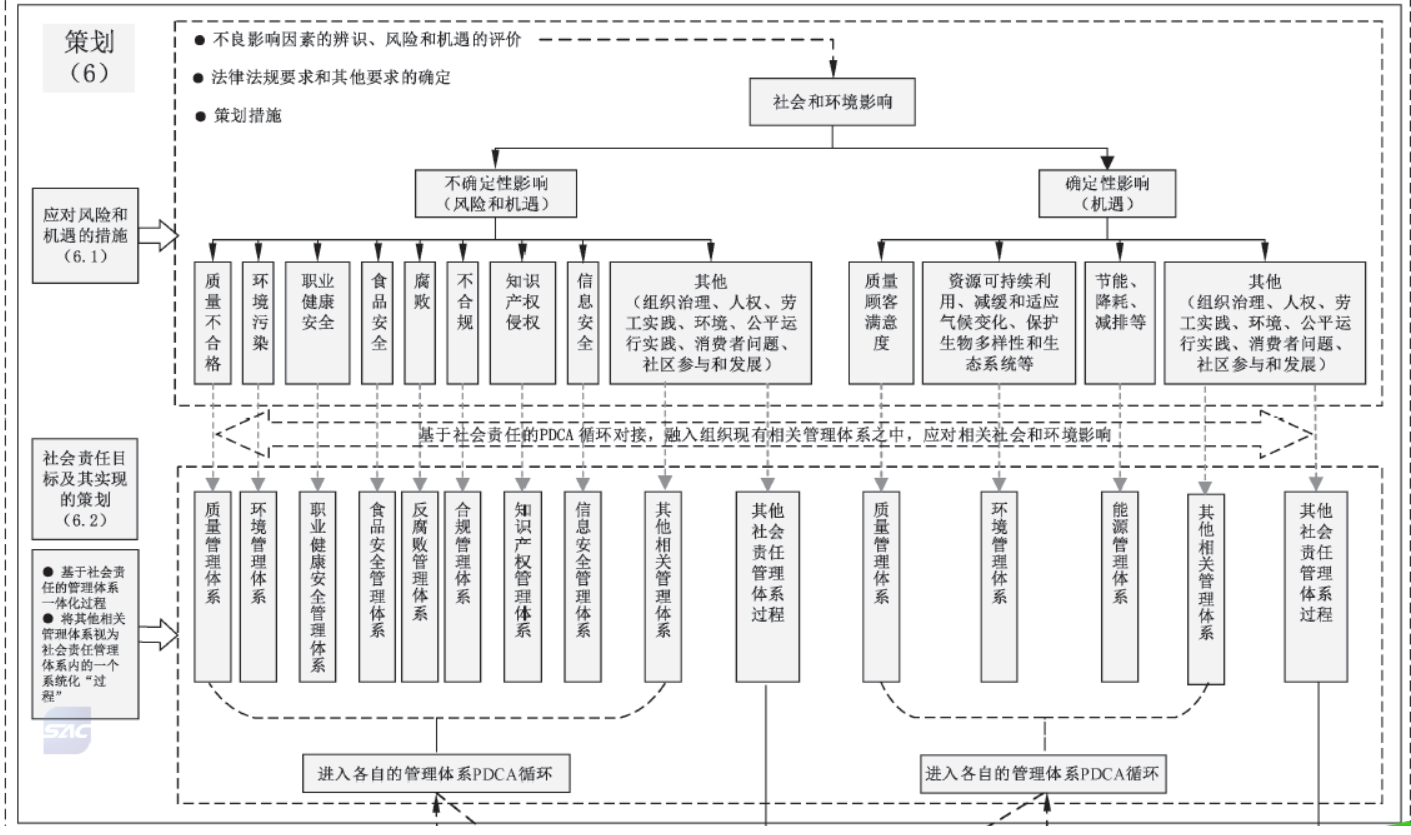 使組織能夠以社會責(zé)任為抓手,從頂層治理(價值觀、使命、精神和發(fā)展戰(zhàn)略等)視野出發(fā),統(tǒng)領(lǐng)、規(guī)范、協(xié)調(diào)和融合組織內(nèi)其他相關(guān)管理體系(如質(zhì)量管理體系、 環(huán)境管理體系、職業(yè)健康安全管理體系、食品安全管理體系、反腐敗管理體系、合規(guī)管理體系、知識產(chǎn)權(quán)管理體系、信息安全管理體系等),有效實現(xiàn)組織管理體系的一體化。