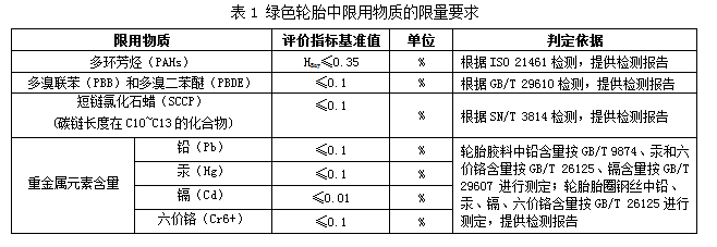 3、環(huán)境屬性。參照已發(fā)布并實(shí)施的《輪胎中限用物質(zhì)的限量要求》國(guó)家標(biāo)準(zhǔn),對(duì)輪胎胎面、胎側(cè)、胎圈(除鋼絲以外部分)、三角膠、內(nèi)襯層、內(nèi)胎、墊帶、胎圈鋼絲等各部位的多環(huán)芳烴(PAHs)、重金屬(鉛、汞、鎘、六價(jià)鉻)、短鏈氯化石蠟(SCCP)、多溴聯(lián)苯(PBB)和多溴二苯醚(PBDE)等限用物質(zhì)提出了要求,具體評(píng)價(jià)指標(biāo)基準(zhǔn)值及判定依據(jù)詳見(jiàn)表1。