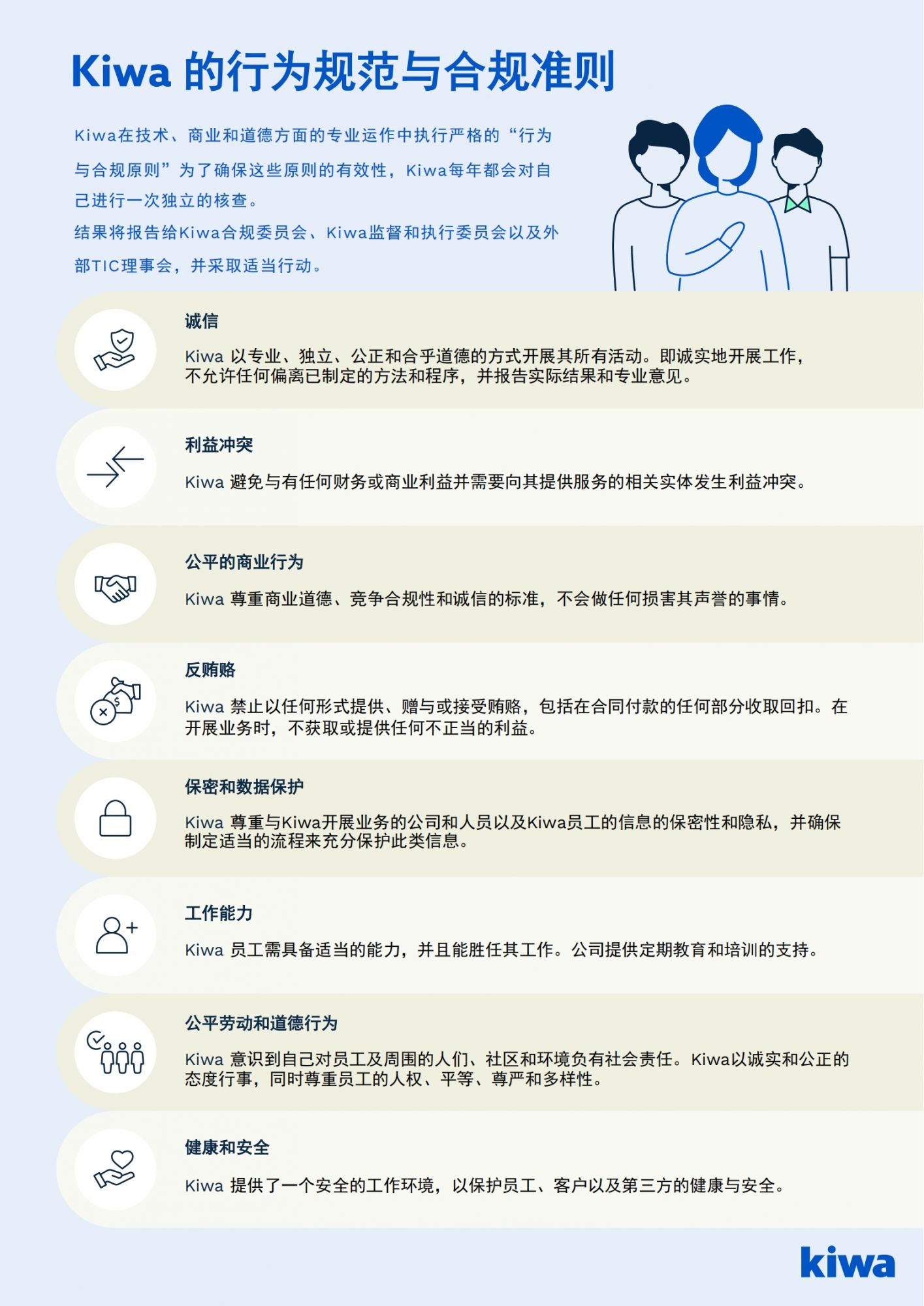 我們的行為準(zhǔn)則與合規(guī)要求嚴(yán)格遵循 TIC 理事會(huì)合規(guī)框架的相關(guān)規(guī)定,Kiwa 作為該理事會(huì)的成員,始終積極參與其中。TIC 理事會(huì)是匯聚國(guó)際知名檢驗(yàn)、檢測(cè)與認(rèn)證機(jī)構(gòu)的全球性行業(yè)組織,致力于推動(dòng)在安全、質(zhì)量、健康、倫理及可持續(xù)發(fā)展方面的最佳實(shí)踐與最高標(biāo)準(zhǔn)。